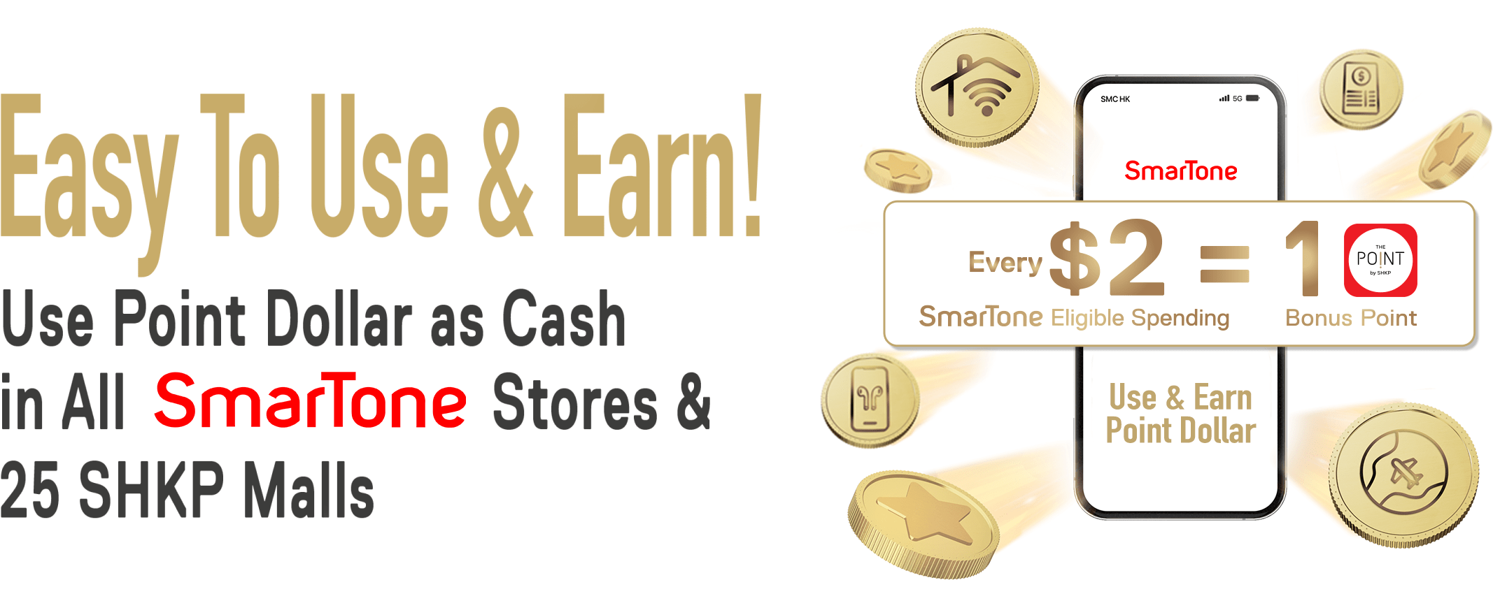 Bonus points can be converted into Point Dollar via The Point app and spent in all SmarTone stores to pay for mobile subscription, monthly bill, 5G broadband subscription, roaming, handsets and accessories and more. They can also be used as cash in 25 designated SHKP malls and GO PARK Sai Sha in Hong Kong or simply redeem your favorite gifts from The Point app!